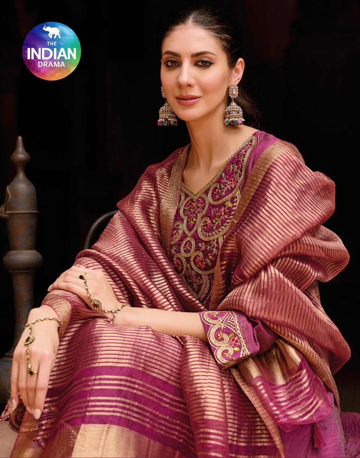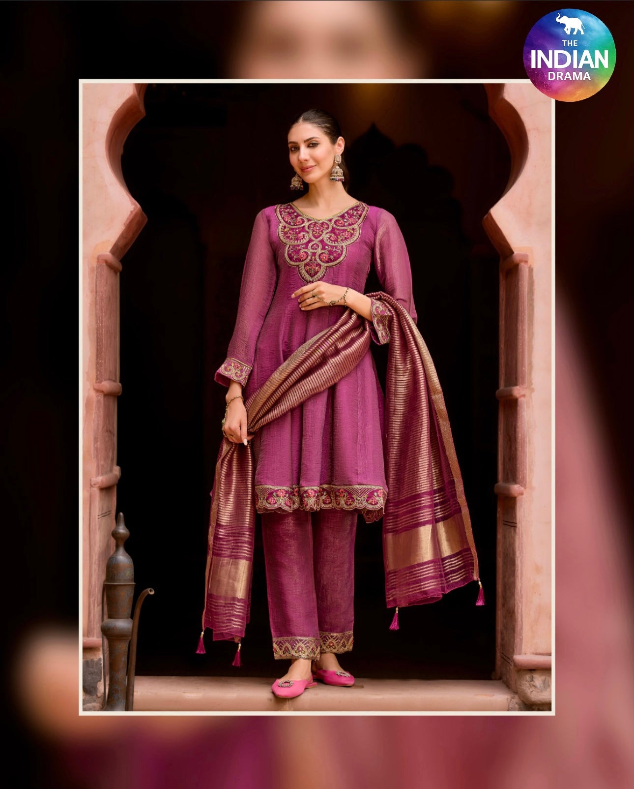 Add refined charm to your ethnic wardrobe with this elegant plum suit set. Featuring detailed embroidery on the kurta, coordinated pants, and a richly woven dupatta, this ensemble blends traditional craftsmanship with a modern silhouette. Ideal for festive occasions, intimate celebrations, and day functions, it promises comfort, grace, and timeless appeal.